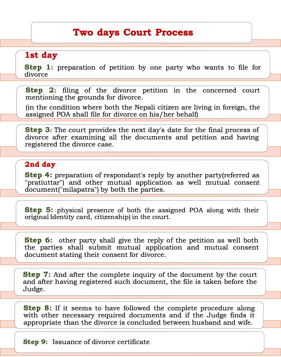 | 4 | If both the foreigners, husband or wife is in Nepal at the time of divorce, then, must appear in the court otherwise, Authorized Power of Attorney (POA)(“Adhikrit wareshnama”) is required that must be notarized by the Notary lawyer in his/her residing foreign country. |